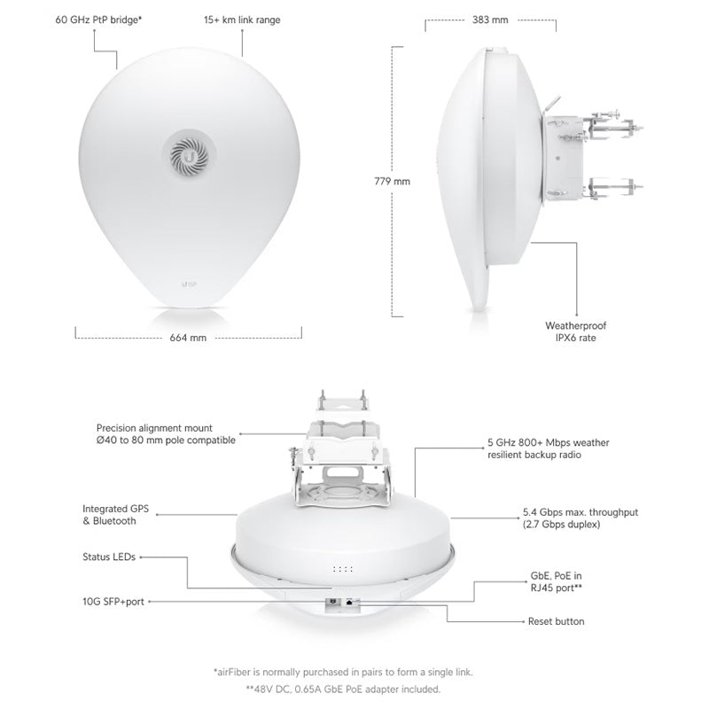 Multi-gigabit, 60 GHz bridge designed to create long-distance links and deliver 5.4 Gbps total throughput (2.7 Gbps duplex) over them.