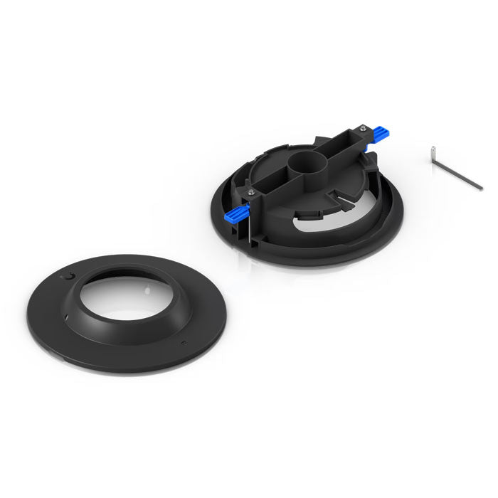 Dome camera mounting accessory for recessed installation into a wall or ceiling. Comes in Black or White colours.