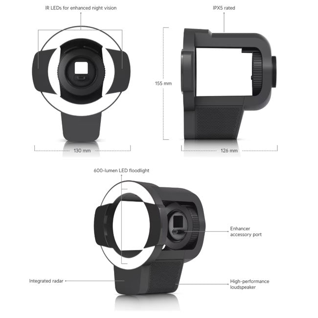 Long-range IR LED, floodlight, and radar detection accessory designed specifically for the G6 Pro Bullet and AI Pro. The infrared illumination enables clear visibility in complete darkness and extending surveillance coverage.