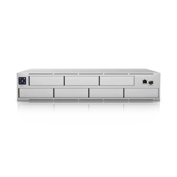 The UNVR Pro is a UniFi OS Console that runs the pre-installed UniFi Protect application and has a 7-drive hard disk drive (HDD) bay that offers the greatest storage capacity of any UniFi OS Console.