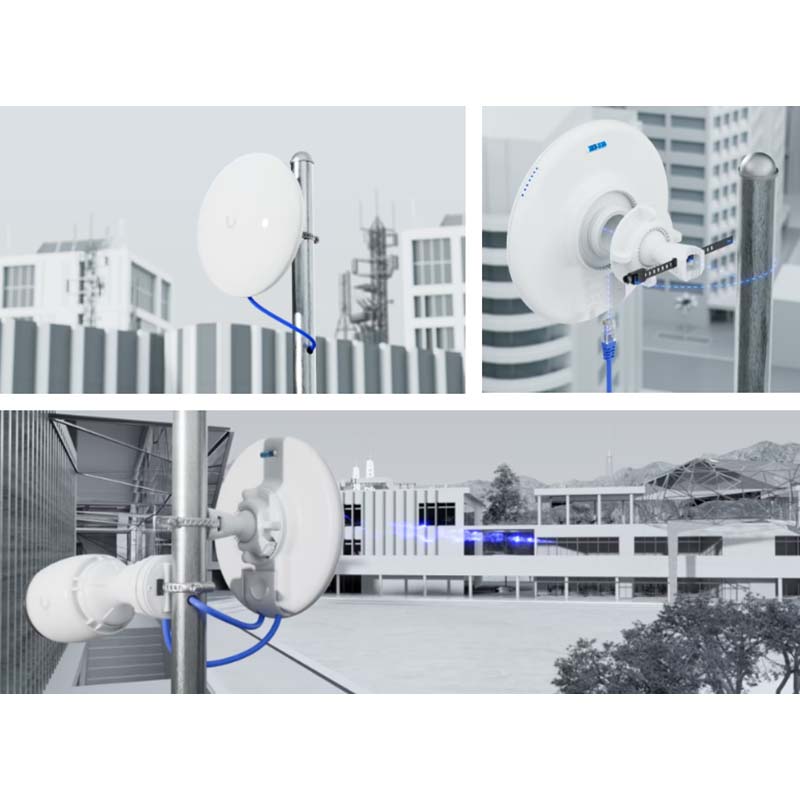 5 GHz wireless bridge with PoE output that connects at 5+ km distances or seamlessly uplinks to UniFi WiFi.