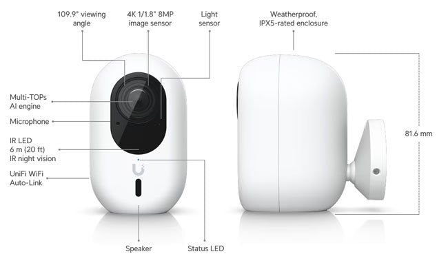 Plug-and-play, 4K WiFi-connected camera with a 1/1.8" 8MP image sensor, Multi-TOPs AI Engine, and two-way audio.